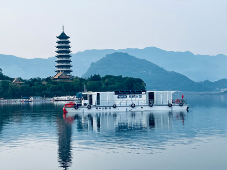 公司研發的加壓控藻船,以玻璃鋼船體為平臺,配置藍藻打撈、壓力控藻和曝氣裝置...